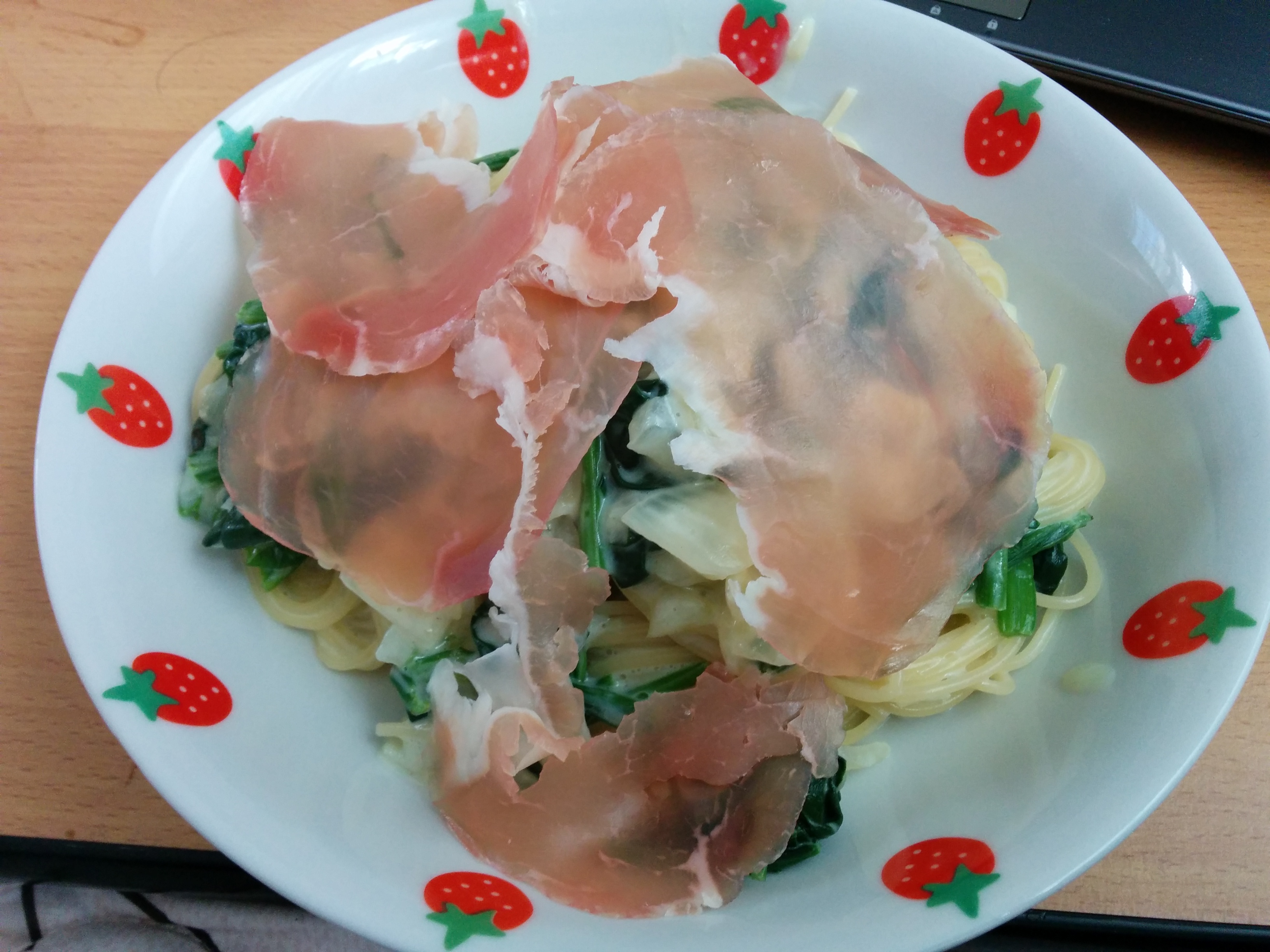 たまねぎ, ほうれん草, パスタ, 乳製品, 牛乳, 生ハム, 肉, 豚 生ハムを乗せたクリームパスタ 2014年12月28日 Kenji ほうれん草のクリームパスタに生ハムを乗せていただきました。 ほうれん草は旬ですからね、栄養価も高いです。 特徴 ほうれん草を油と調理しているので、ベータカロテンを効率よくとることができます。 風の予防にも効くと言われているので今の時期にピッタリです。ビタミンE、葉酸、鉄分も豊富なので 女性におすすめです。 また、今回使った生ハムは伊藤ハムの生ハムロースです。